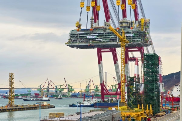 In shipyards in Korea and China, the two floating facilities are being built, thousands of kilometres from their final offshore destination in Mexico. Thousands of pieces of equipment and components are being assembled into massive steel blocks the size of buildings, before being lifted, integrated and tested.