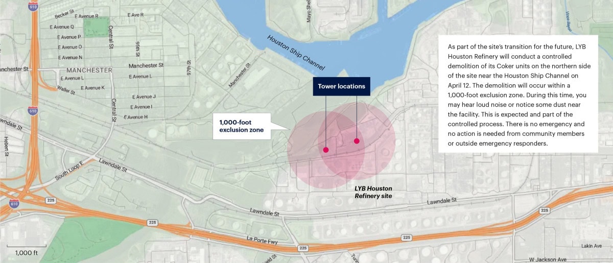 On April 12 2026, the LYB Houston Refinery located at 12000 Lawndale, Houston, TX, 77017 will safely carry out a planned, controlled demolition of its Coker units on the north side of the site near the Houston Ship Channel.